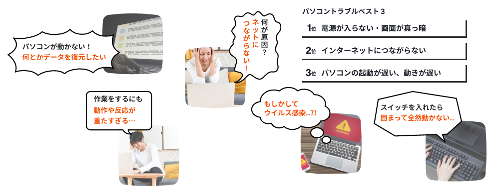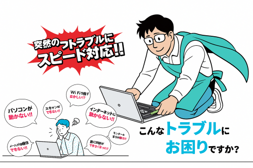 インターネットが繋がらない・メールが届かなくなったなどのパソコントラブルから、コンピューターウイルスへの感染やランサムウェアなどのセキュリティ対策までサポート。